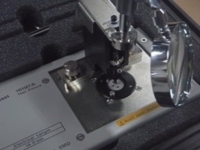 インピーダンスアナライザとテストフィクスチャを用いた測定の様子