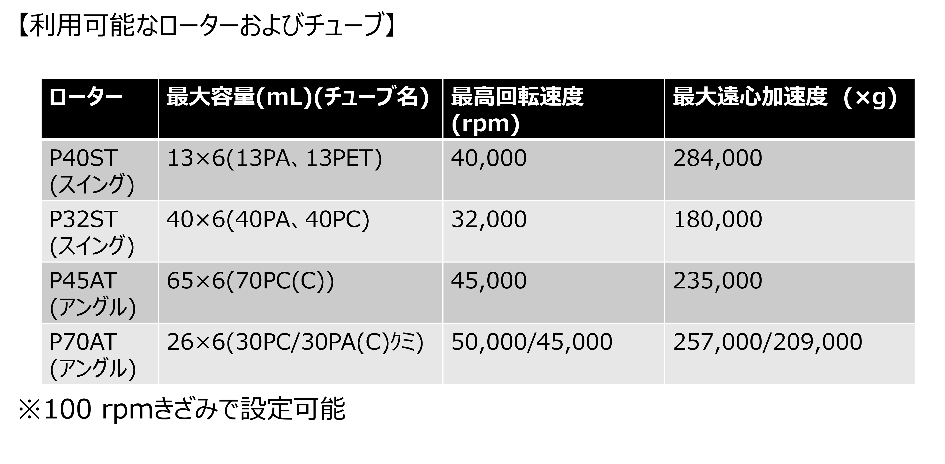 ・利用可能なローターおよびチューブ:画像の表を参照