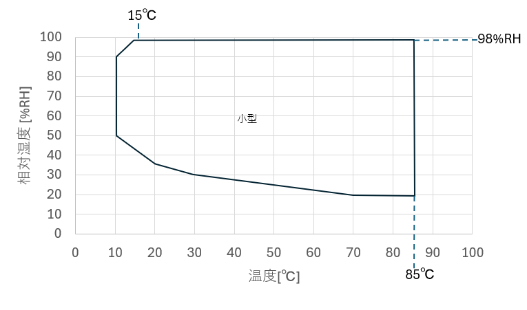 湿度範囲:20%RHから98%RHまで(温度により制御範囲が異なる。詳しくは下記グラフを参照)
