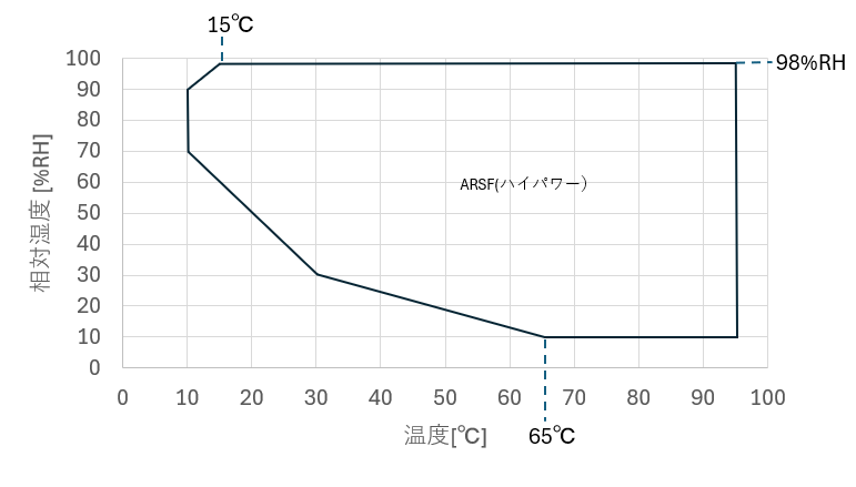 湿度範囲:10%RHから98%RHまで(温度により制御範囲が異なる。詳しくは下記グラフを参照)