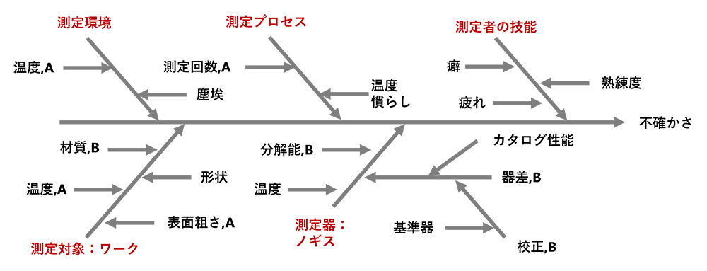 正しい測定方法を身につけた後は、信頼性の高い試験に不可欠な「不確かさの算出」にチャレンジしてみませんか? ものづくりの競争⼒を⾼めるには、品質を保証するための検証が必要不可⽋です。さらに、産業のグローバル化が進展する現在において、この保証を他国でも相互に利⽤することがますます望まれています。講習会では、ノギスでの測定による「測定の不確かさ」を算出するときに使用する特性要因図(図4)などを用いながら、信頼性の⾼い試験に不可⽋な「不確かさ算出の基礎」について、事例を交えながら説明します。