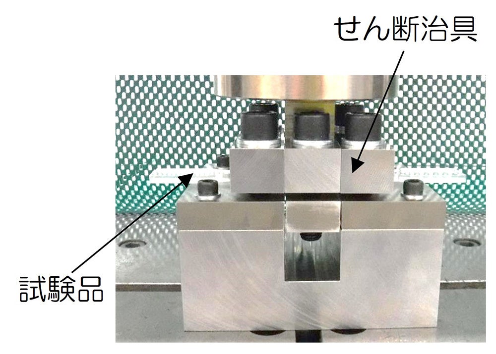 試験には万能試験機を用いました。樹脂材料をせん断試験するための専用の治具を用いました(図13(b)参照)。せん断試験治具の上端を圧縮することで、試験品をせん断することができる構造になっています。