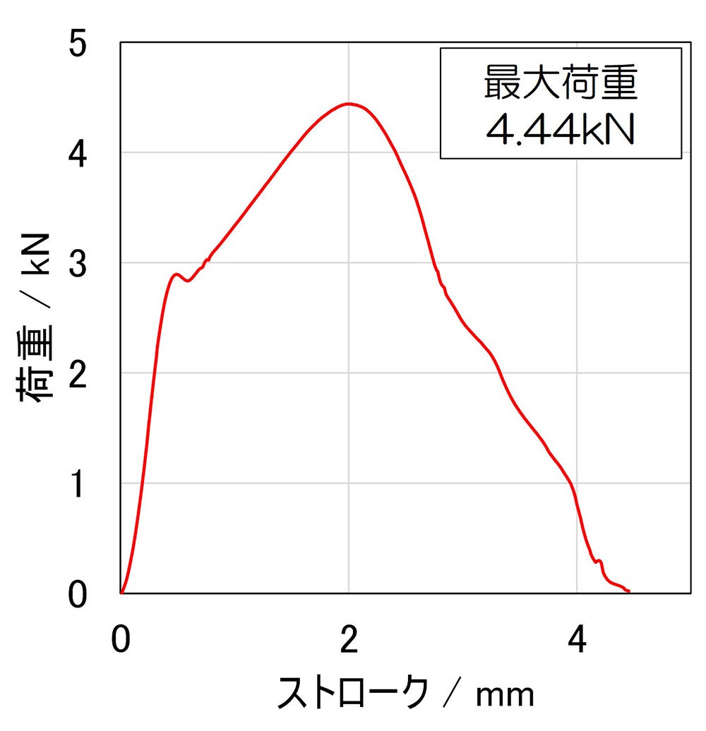 荷重とストロークの関係を図13(c)に示します。初期の直線な挙動が変わるところで、一時的に荷重のピークが見られます。これは試験品に試験治具が食い込む際に、試験品と試験治具の間に生じた摩擦のピーク(静止摩擦力)と考えられます。最大荷重は4.44 kNであり、試験後には2面がせん断されている様子が見て取れます(図13(d)参照)。この試験治具では2面がせん断されるため、せん断応力を算出する際にはせん断面の面積には注意が必要です。