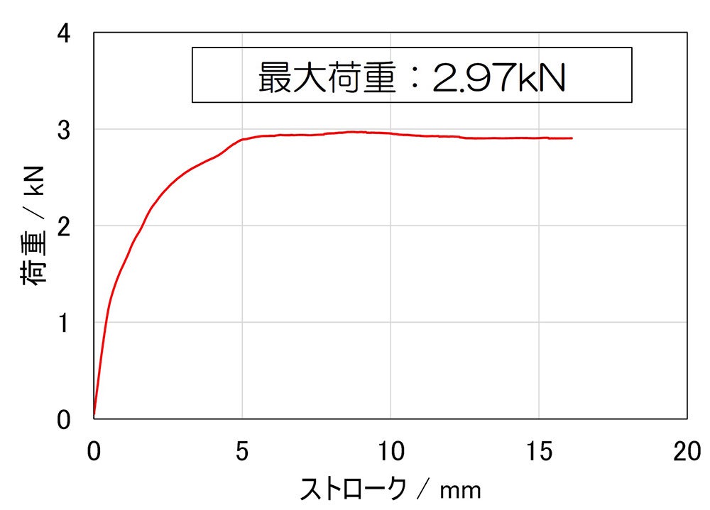 荷重とストロークの関係を図12(c)に示します。初期の直線領域は弾性範囲と考えられますが、弾性限界を詳細に調べるには工夫が必要です。例えばひずみの測定を並行して実施することや、負荷と除荷のサイクルを段階的に増大させ、除荷後のストロークが初期ストロークと差が出るまで繰り返す方法が有効です。本試験は曲げ変形性能の調査ですので、変形するまで試験機を連続的に駆動させました。