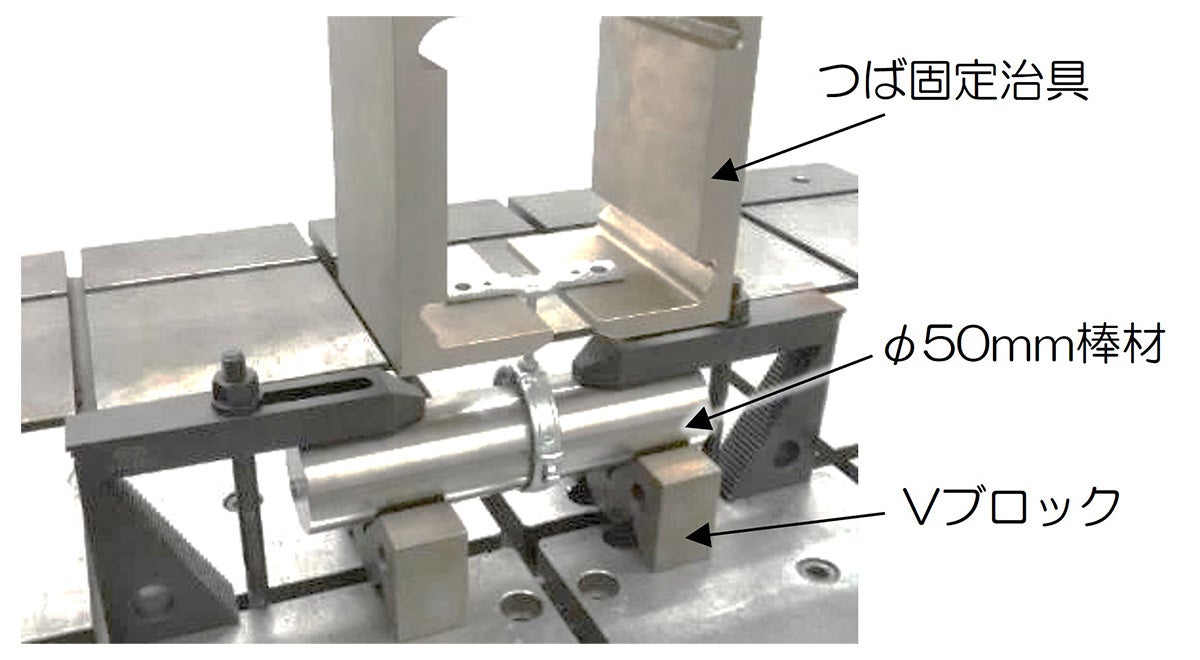 試験には図10に示した万能試験機を用いました。この装置は門型の構造をしており、クロスヘッドと呼ばれる箇所を上下に動かすことで、試験品に引張荷重、圧縮荷重を負荷することができます。試験治具を工夫することで、引張試験、圧縮試験のほか、曲げ試験、せん断試験にも適用することが可能です。試験品のバンド部に円柱状の鋼棒を挿入し、この鋼棒を固定しました。都産技研が保有している万能試験機にはT字型の溝が施された定盤が設置されており、さまざまな試験品の固定が可能です。また、試験品のねじ固定部にはT字の構造物に引張力を加える治具を適用して試験を実施しました(図9(b)参照)。なお、バンド部を固定してねじ固定部を引っ張っていますが、外力はバンド部にも伝わるため、駆動側と固定側は入れ替えても結果は変わりません。