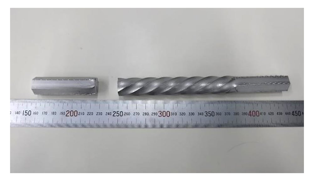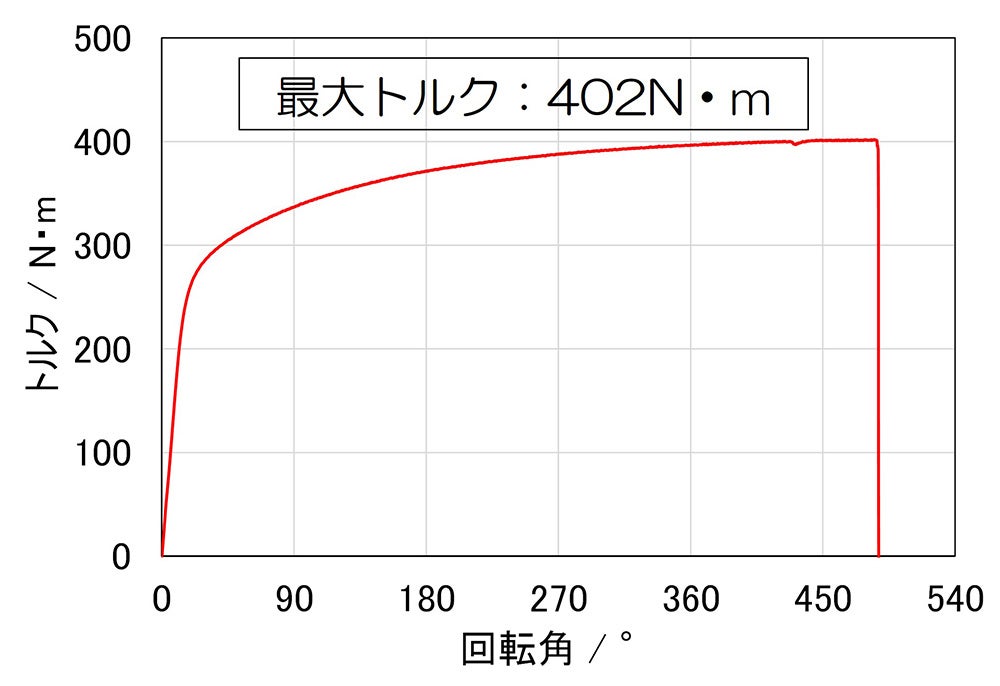 トルクと回転角の関係を図14(c)に示します。金属材料の引張試験における荷重とストロークの関係と同様、初期は弾性変形のため直線的な挙動を示し、挙動が変わったところから塑性域に入ったと読み取れます。最大トルクは402 N・mでした。試験後の状況(図14(d)参照)からねじり変形の様子が観察できます。