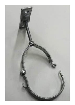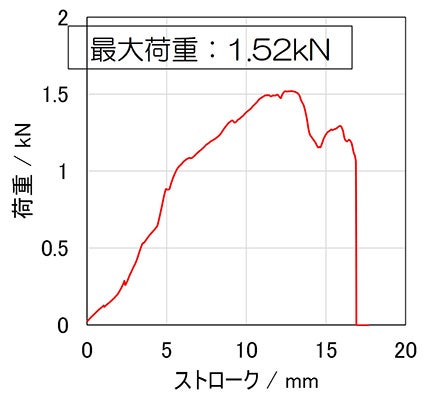 試験結果は、図9(c)のように横軸が試験機のストローク(試験品自体の変位ではない)縦軸が荷重のグラフで表されます。最大荷重は1.52 kNでした。試験後の状況(図9(d)参照)を観ると、バンドの開閉部が破壊している様子が確認できます。