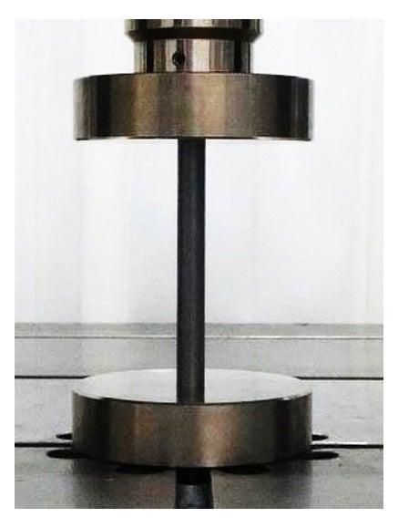 単純な丸棒への圧縮試験の模式図を図4に示します。引張応力と同様の計算式で応力を求めますが、極性(応力の向き)が反対なので、圧縮の場合は符号をマイナスで表記する場合があります。金属材料ではほとんどの場合、引張特性と圧縮特性が対称なので、圧縮試験をすることはありません。しかし、特性が非対称な材料では圧縮特性の方が重要な場合もあります。例えば、コンクリートの圧縮強度は引張強度の10倍ほど強いとされており、主に圧縮試験が実施されています。