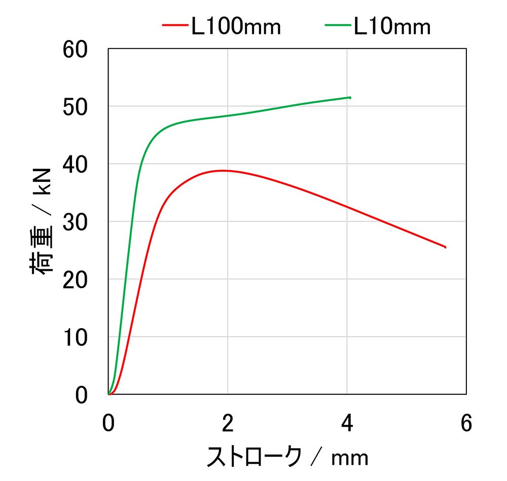 荷重とストロークの関係を図11(c)に示します。長い方が変曲点荷重(横に曲がってしまう限界の荷重)は小さいことが読み取れます。試験後の状況(図11(d)参照)を観ると、長い方は『く』の字に座屈※3しているのに対し、短い方では、中央部が膨らむように変形(壁面座屈)している様子が確認できます。