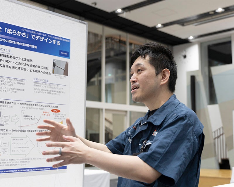 ロボット技術グループの森田裕介 主任研究員は「安全を『柔らかさ』でデザインする」と題し、柔らかさの定量的な評価手法について説明を行いました。将来的にロボットと人間が協働作業を行う場面を想定すると、接触時の安全確保が重要になります。ロボットを覆うカバーなどに用いる柔軟材料について、本手法で柔らかさを定量化できれば、安全性の評価につながります。
