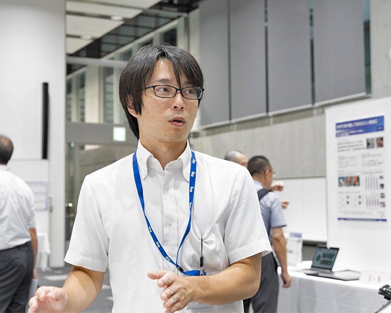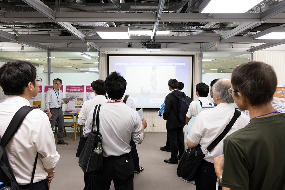 本部中2階のイベントスペース「東京イノベーションハブ」では、都産技研の技術シーズを紹介するポスターセッションが開かれました。各技術分野で取り組む研究テーマについて、担当研究員が直接説明を行うものです。2日間で計35テーマの説明が行われ、来場者の方々が説明に耳を傾けたり、質問をしたりする様子が見られました。