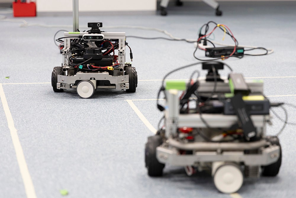 また、午前中には、テレコムセンターにある「DX推進センター」の見学ツアーも実施し、約40名の方々にご参加いただきました。ロボット技術グループでは、これまで共同研究等で手がけたロボットや、擬似実証実験スペース、傾斜路走行試験装置などの評価設備を紹介しました。また、通信技術グループでは、5G評価室にて、Wi-Fiと5Gの通信の違いをロボットを用いて実演。見学者から技術的な質問も複数寄せられました。