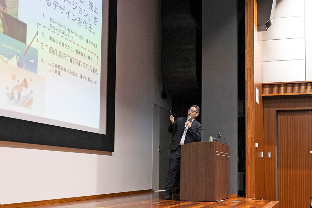 本部5階の講堂では、blueqat株式会社CEO 湊 雄一郎 氏による特別講演「量子コンピュータの産業応用と、ものづくり企業の協業のコツ」が行われました。量子コンピュータの産業応用に関する取り組みとして、同社が提供する「量子AIクラウド」を活用した素材配合開発の事例が紹介されました。