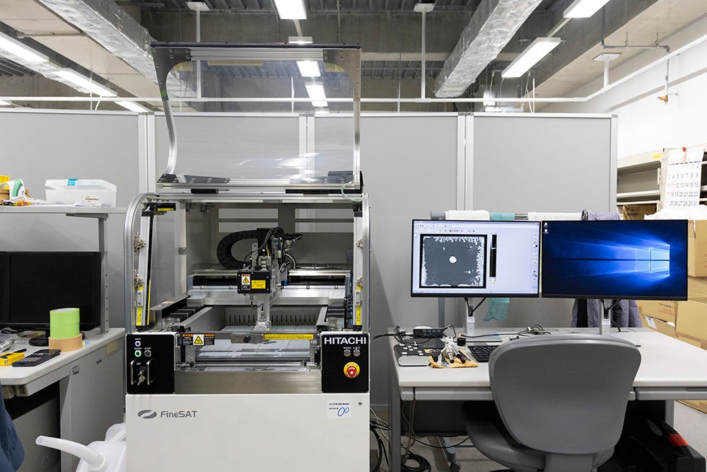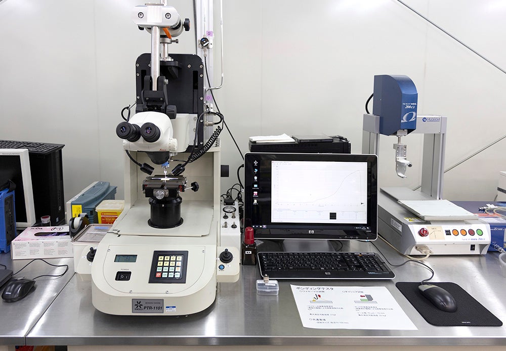 5階の「マイクロマシン実験室」では、半導体チップを回路基板に実装する装置である「エポキシダイボンダ」や「ワイヤーボンダ」、その接合強度を評価する「ボンディングテスタ」といった装置を展示。髪の毛の約4分の1の太さ(25ミクロン)のAu(金)ワイヤが、チップから基板に配線される様子や、そのワイヤを引っ張って接合強度を評価する様子から、ミクロの世界をご覧いただきました。