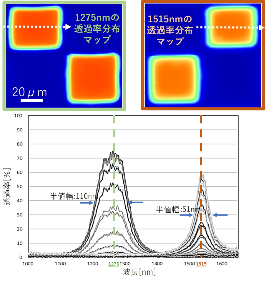 (上)顕微分光光度計による透過率の2次元マッピング (下)各画素のバンドパス透過率スペクトル