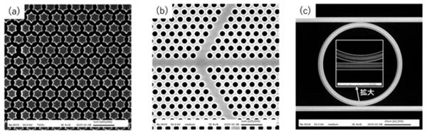 (a)ナノ周期構造 (b)フォトニック結晶光導波路 (c)マイクロリング共振器