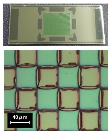 (上)近赤外バンドパスフィルタ全体写真 (下)光学顕微鏡による拡大写真