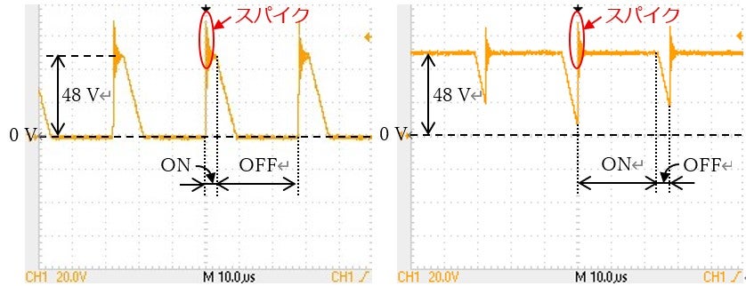 また、図1から、両図とも、ON時間の立ち上がり直後にスパイクのように尖った波形の電圧(以下、スパイク電圧)が発生していることがわかります。