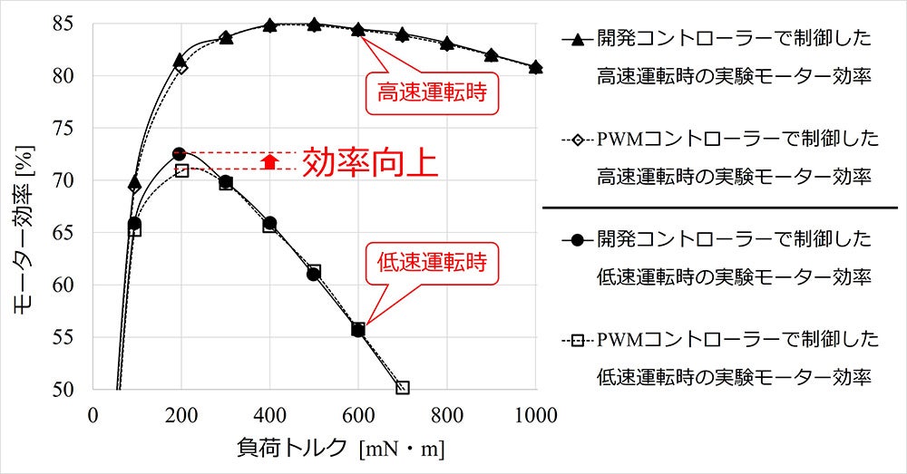 スパイク電圧によって発生するパルスピークの高い電流は、モーターのトルクとして有効に使われにくく、エネルギーのロスになります。したがって、PWMコントローラーでは、低速運転時にスパイク電圧を多く含むことでモーターのトルクが減少し、効率低下しやすく、開発したコントローラーの方がモーター効率は高くなります。