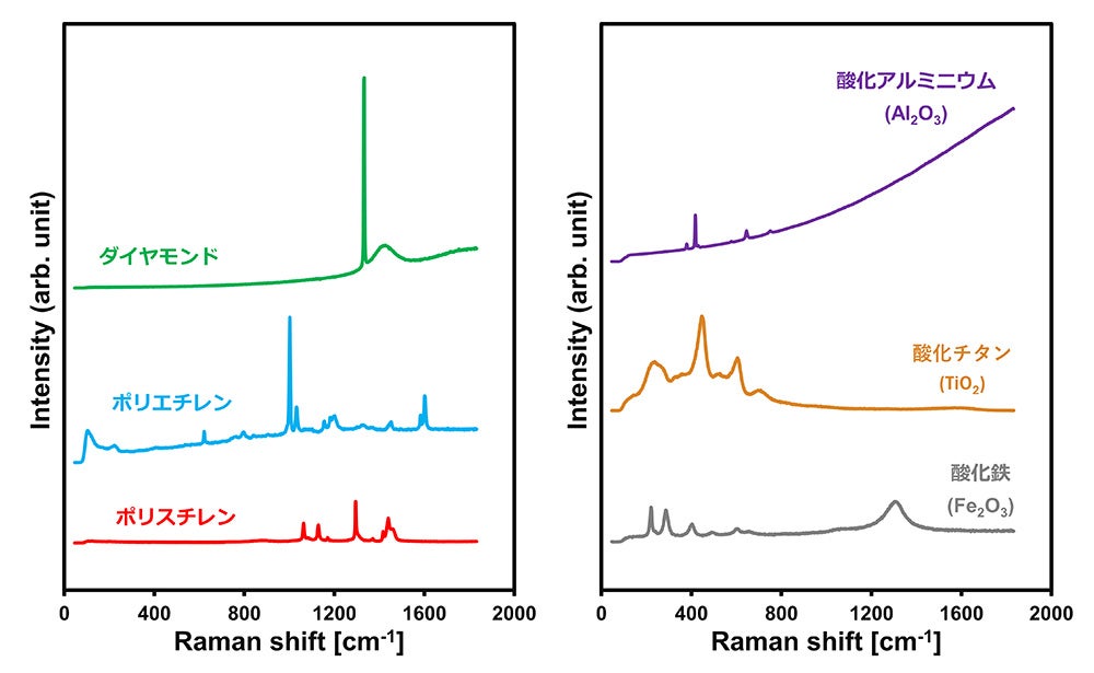 代表的な測定事例として、ダイヤモンド、ポリエチレン、ポリスチレン、酸化アルミニウム、酸化チタン、酸化鉄、から得られたラマンスペクトルを図1に示します。図からわかるように、材料の種類に依存して、異なる波数帯にラマンピークが発生するため、このピークの位置を確認することで、物質の特定が可能となります。