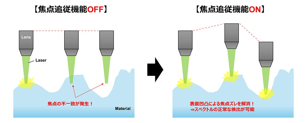 ラマン分光測定は、数μmオーダーのピンポイントでの定点測定だけでなく、ステージを走査(縦横方向に移動)させながら測定することでマッピング像を取得することも可能です。また、この装置では、図4に示すように、測定時のレーザーの集光状態の変化をリアルタイムで読み取ることで、自動で焦点を合わせながらマッピング測定を行えるシステムが組み込まれており、段差や表面凹凸の激しいサンプルであっても良好なマッピング像を取得することができます。