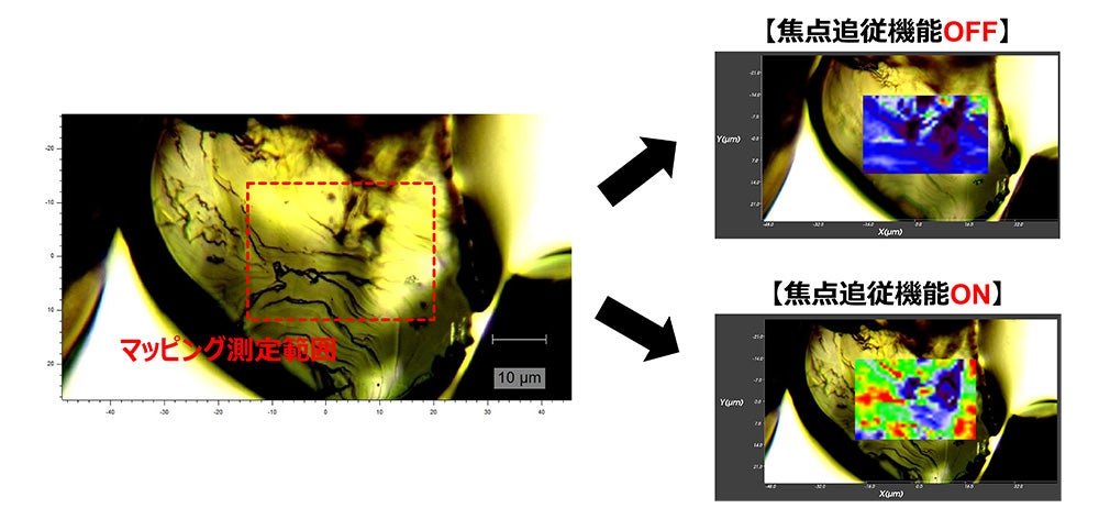 一例として、焦点追従機能をオフにした場合とオンにした場合での、ダイヤモンド粒子から得られるスペクトル強度をマッピングした結果を図5に示します。図のように焦点追従機能がオフの場合は、表面凹凸により焦点の不一致が発生し、スペクトルの検出強度が低下してしまっている箇所(黒色や青色で表示されている部分)が多く見られます。一方でオンの場合は、自動焦点合わせにより、スペクトル強度の高い部分(赤色や黄色で表示されている部分)が増加していることがわかります。