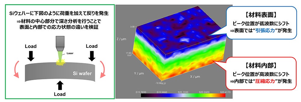 その一例として、Siウェハーの両端に重りを乗せて反りを発生させたSiウェハーに対して深さ分析を行い、深さ方向へのピーク位置の変化を可視化した結果を図6に示します。図のように、材料表面では反りにより引張応力が発生しており、この応力状態に依存してピーク位置が低波数側(図中の青色で表示されている部分)にシフトしている様子が見られます。一方で、材料内部では圧縮応力が発生しているため、表面側と比較してピーク位置が高波数側(図中で赤色で表示されている部分)へシフトしていることがわかります。このように、ラマン分光測定の深さ分析を活用することで、非破壊で材料表層の応力分布状態を測定することも可能です。