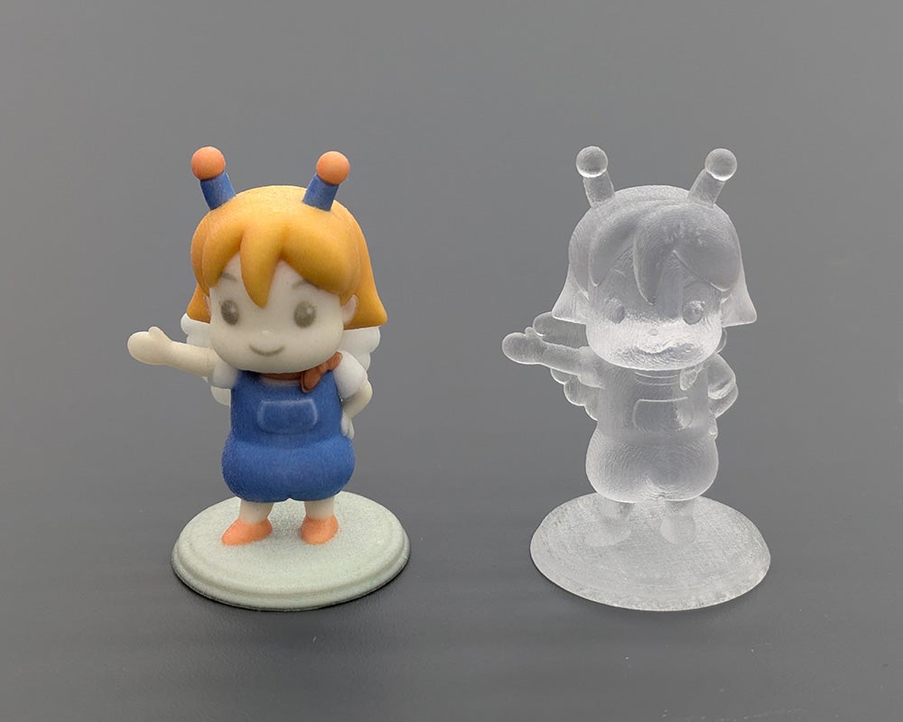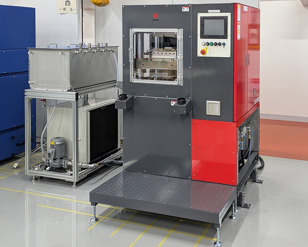 これらの機器では、試作工程を効率化しながら精度の高い試作品の製作が可能です。フルカラー対応三次元造形装置やマルチマテリアル対応三次元造形装置は、高速で高画質・高精細な造形ができ、形状だけでなく色や意匠を含めた一体的なデザインの検討を短期間で行えます(図5,6)。小型射出成形機は小さな部品を高精度に成形し、原材料や成形条件の最適化を迅速に確認できるため、量産移行前の品質確認に有効です(図7)。電動熱プレス機は位置・荷重・速度・温度を精密に制御し、積層材の熱圧着や樹脂フィルムの転写など、多様なプレス加工に対応します(図8)。