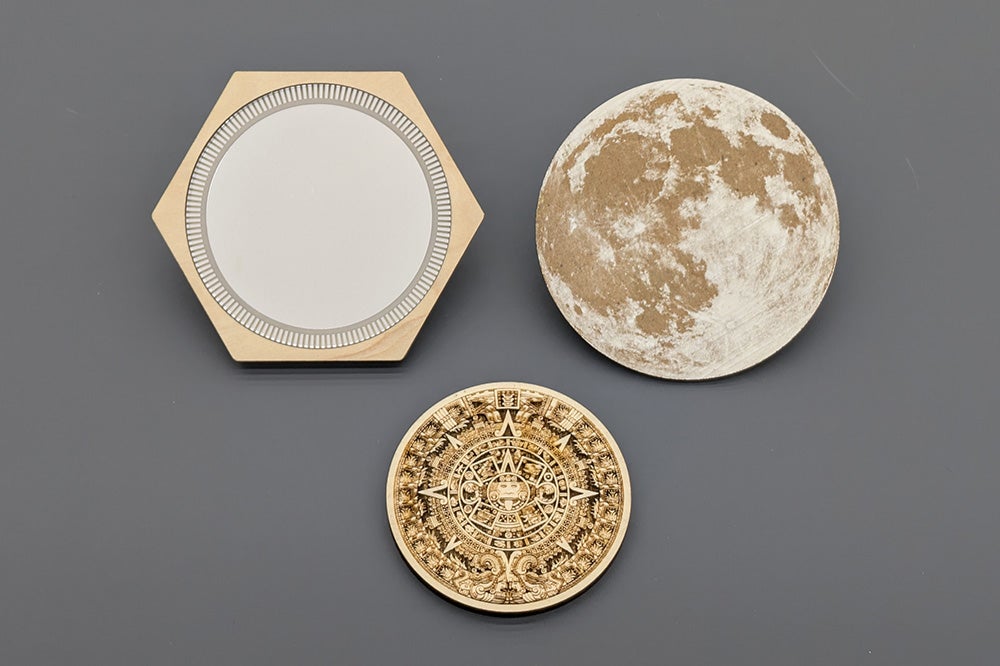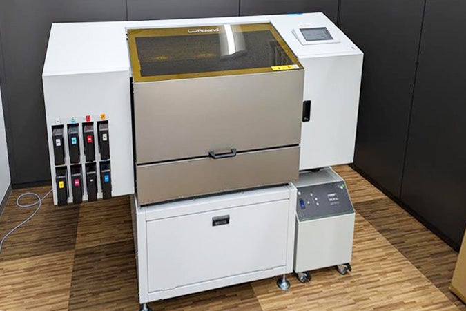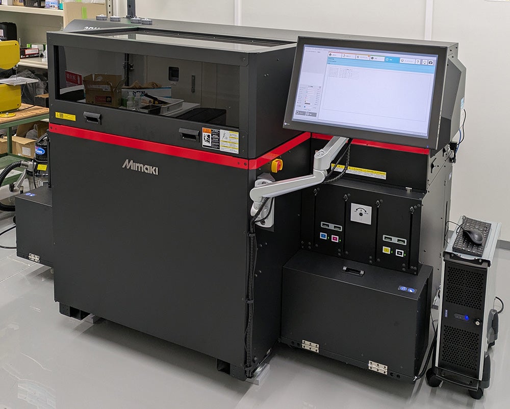 これらの機器では、製品の成形に用いられる金型などの型を必要とせず、多様な素材に対して加工や加飾を行うことができます。レーザー加工機はアクリルや木材、布地などへのカットや彫刻に対応し、精度の高い造形が可能です(図1)。平型カッティングマシンは、レーザー加工機では加工が難しい燃えやすい素材や複合材を安全にカットできます(図2)。UV厚手対応プリンターは立体物に直接印刷でき、実際の製品と同程度のシボ(表面の凹凸模様)表現やニスのような特殊加工を施すことができます(図3)。