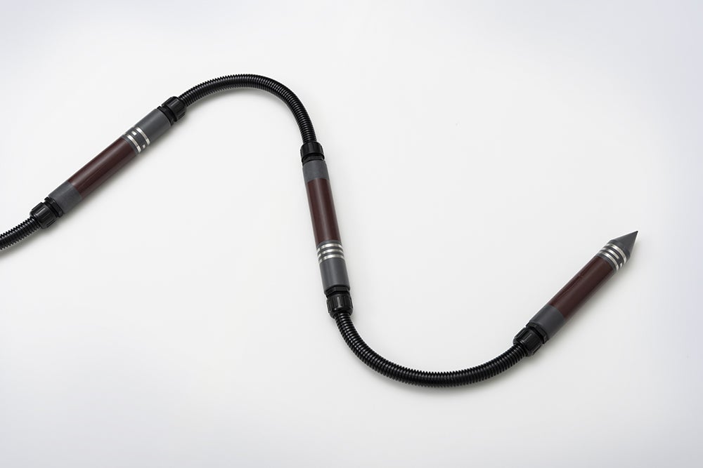 こうして完成した後継機「DIK-G300 TypeJ2」は、円筒状の本体の周囲に電極部を設けています。複数の本体を折り曲げ可能なジョイントで直列に接続することにより、各地層の水分や傾斜をそれぞれ測定することが可能です。本体は3つまで接続可能で、2メートルほどの深さのデータを取得することができます。